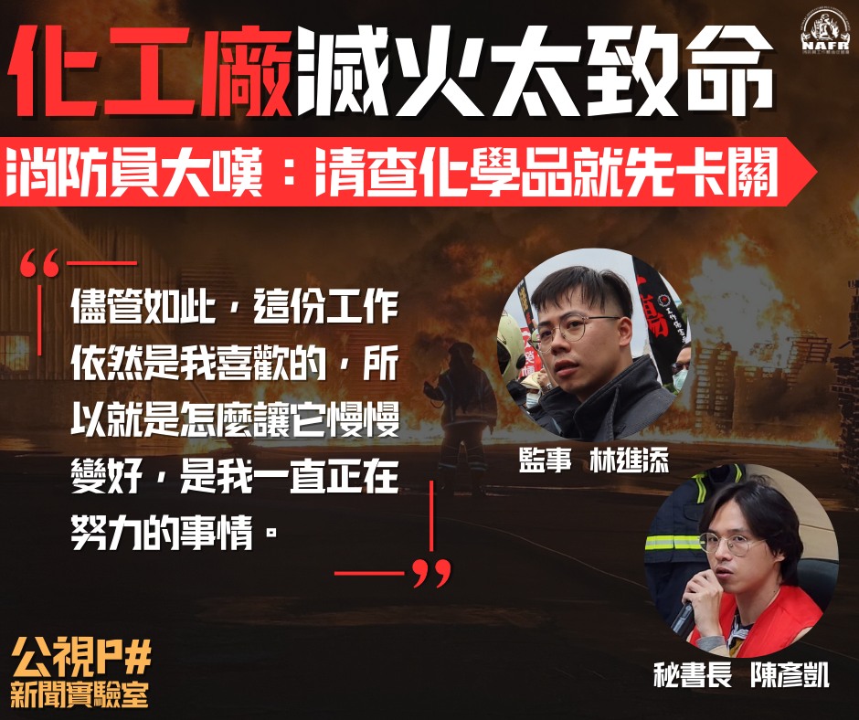 本會監事林進添及秘書長陳彥凱及友會地球公民基金會接受公視新聞實驗室專訪,討論消防員面對工廠火災制度性問題,歡迎大家分享!