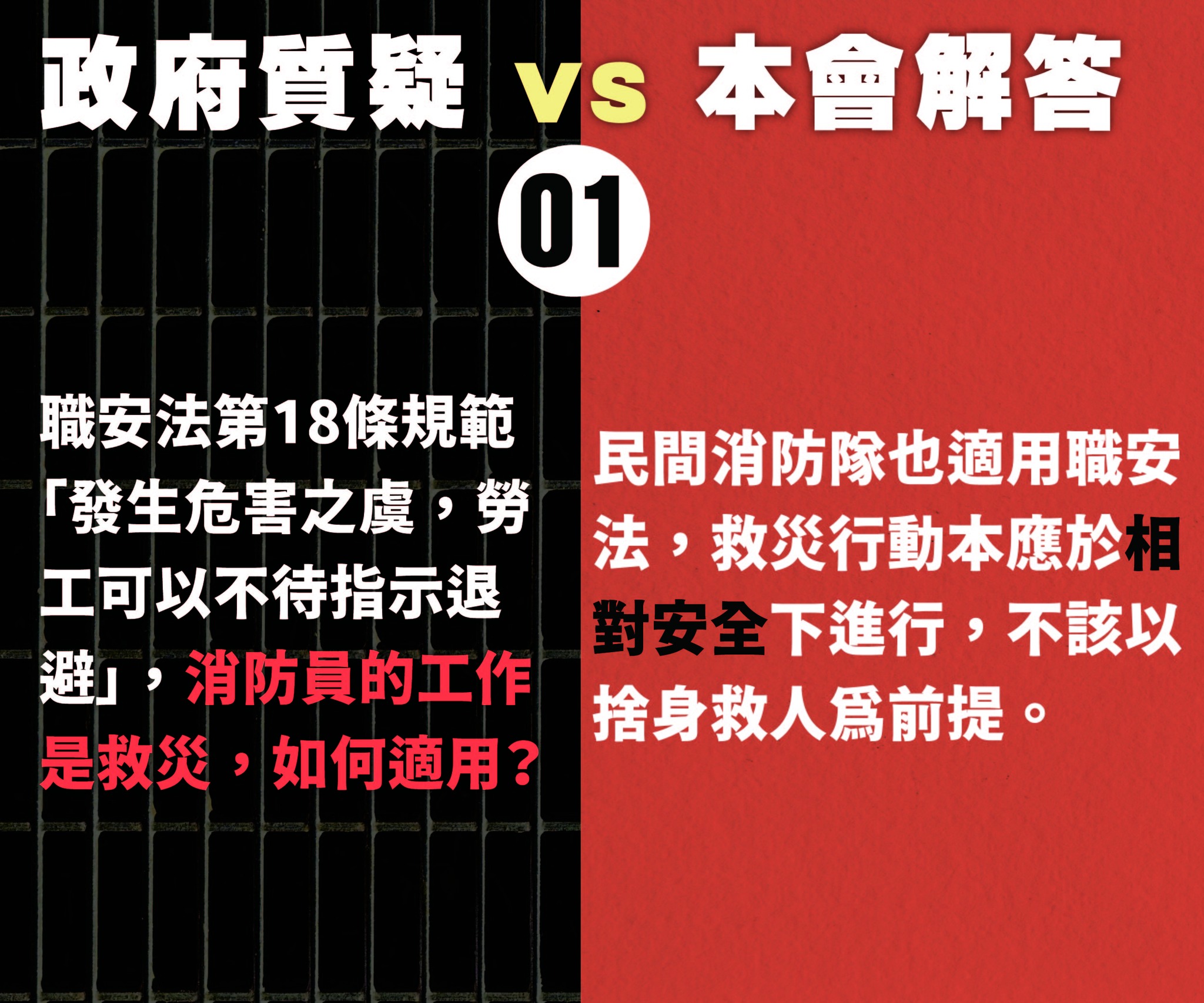 A:消防員是高風險職業,但是也應於「相對安全」的前提下進行救災工作,況且民間的消防隊也適用職安法,一樣也是在「相對安全」前提下進行救災工作。