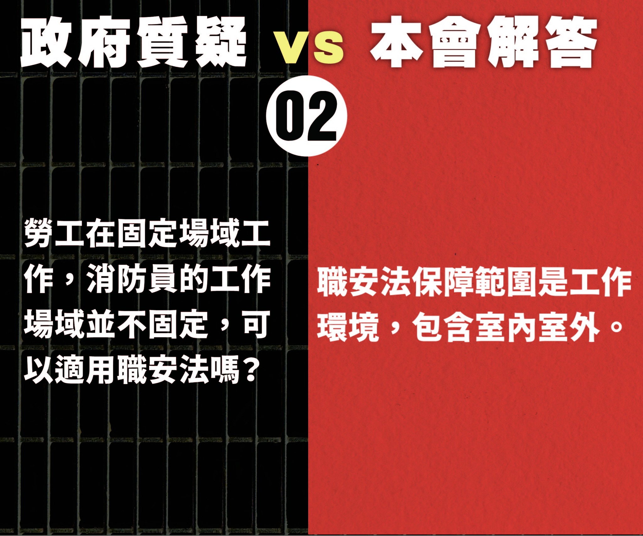 (4) 「職業安全」不應是身份問題:政府宣稱公務法系與勞工法系扞格,但是「安全」不應因為身份有所落差,而是全體工作者都應有的基本保障!