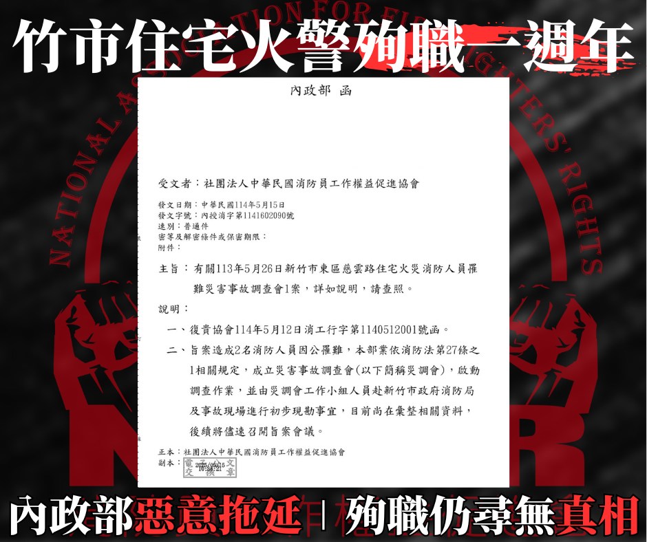 職業安全 新竹市 時事 殉職 竹市住宅火警殉職一週年|內政部惡意拖延,殉職仍尋無真相 by NAFR_taiwan2025-05-26 Comments 0 竹市住宅火警殉職一週年|內政部惡意拖延,殉職仍尋無真相 發生於2024年5月26日的新竹市晴空匯火警案件,造成兩名消防人員殉職,當時內政部依法成立災害事故調查會(災調會),更宣布成立警消勤務安全促進與事件調查會,表示將照顧警消執勤身心權益與健全制度保障。 然而今天已是竹市住宅火警殉職的一週年,內政部災調會卻仍未提出調查報告,未能釐清該案的殉職真相,因此本會呼籲應盡快召開調查會議並釐清殉職真相。 分享此文: 分享到 X(在新視窗中開啟) X 分享到 Facebook(在新視窗中開啟) Facebook 請按讚:喜歡 正在載入... 0 comments on “竹市住宅火警殉職一週年|內政部惡意拖延,殉職仍尋無真相” 發表迴響取消回覆 這個網站採用 Akismet 服務減少垃圾留言。進一步了解 Akismet 如何處理網站訪客的留言資料。 文章導覽 Previous Post Next Post