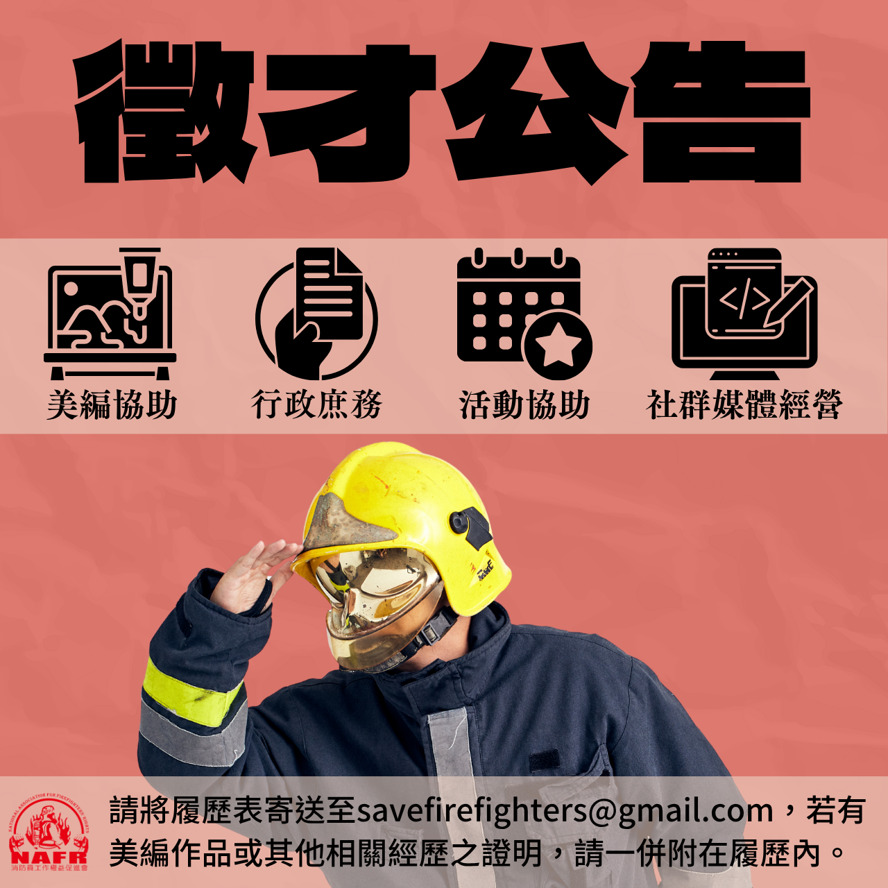 請將履歷表寄送至savefirefighters@gmail.com,若有美編作品或其他相關經歷之證明,請一併附在履歷內,有問題歡迎來信詢問~謝謝