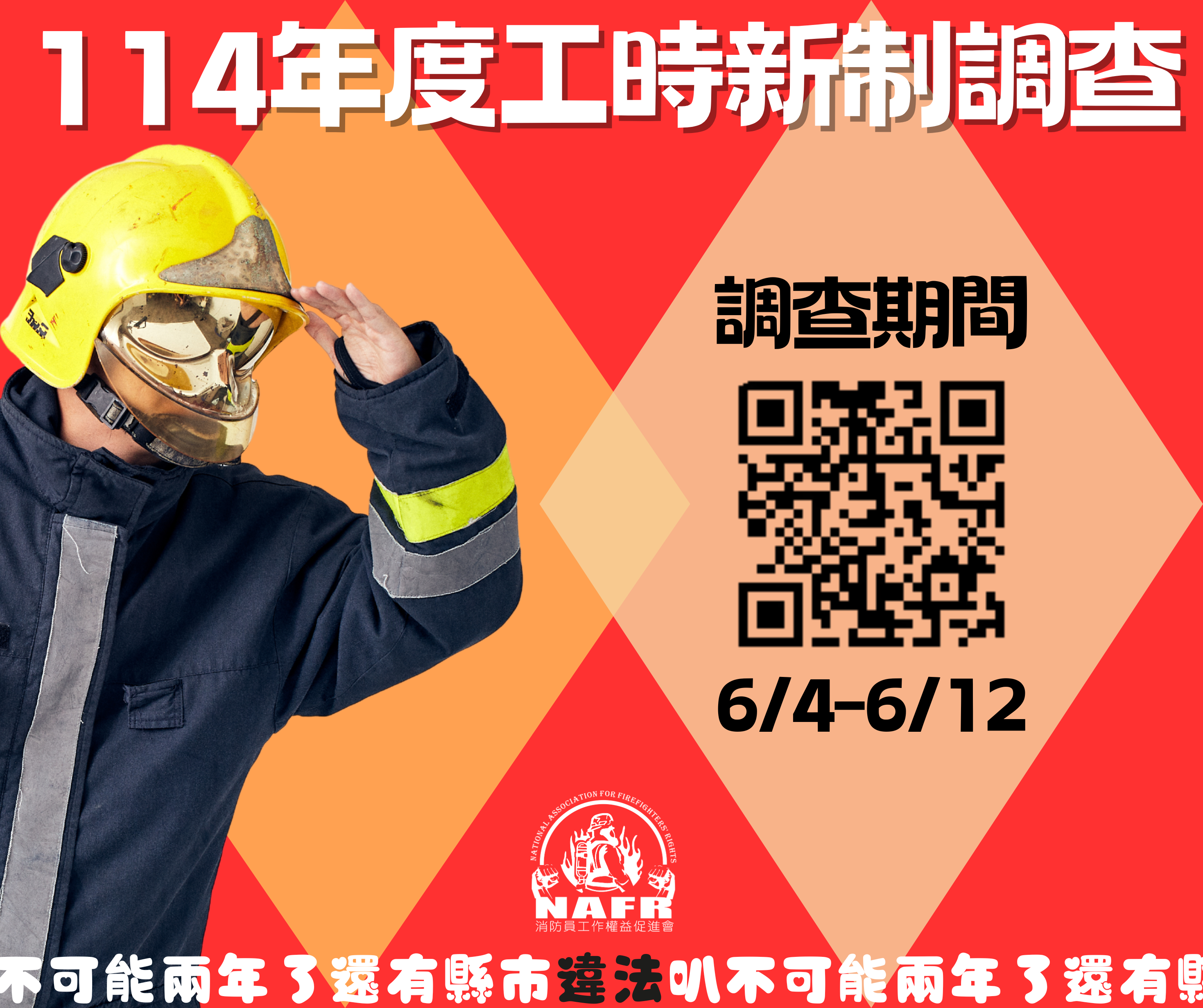工時與人力 114年度工時新制調查 by NAFR_taiwan2025-06-04 Comments 0 《各級消防機關輪班輪休人員勤休實施要點》已經上路兩年,而隨著114年的到來,工時上限也隨之進入調降的第二階段。目前各縣市消防機關勤休制度不一, 協會陸續在中央及地方推動工時新制改善,然而目前仍有新制未落實情況。 消防署預計於0616召開檢討會議,本會將出席反映勤休問題,歡迎基層消防人員填寫表單向本會反映。 調查問卷連結 調查時間|6/4-6/12 消防員協會聯絡電話| (02)2562-5986 *相關問題請具名填寫,本會不接受匿名反映。*相關個人資料僅供協會內部統計使用,不會外流,請放心填寫。 分享此文: 分享到 X(在新視窗中開啟) X 分享到 Facebook(在新視窗中開啟) Facebook 請按讚:喜歡 正在載入... 0 comments on “114年度工時新制調查” 發表迴響取消回覆 這個網站採用 Akismet 服務減少垃圾留言。進一步了解 Akismet 如何處理網站訪客的留言資料。 文章導覽 Previous Post Next Post