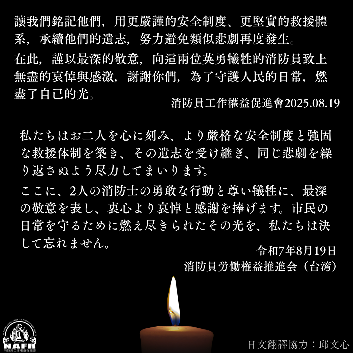 遠く台湾にいる私たち消防員、そして社会全体もまた、この犠牲に深い哀悼の意を抱いております。光成さんと貴志さんの精神は、煙に覆われながらも確かに輝く信念として、人々の心に生き続けることでしょう。
