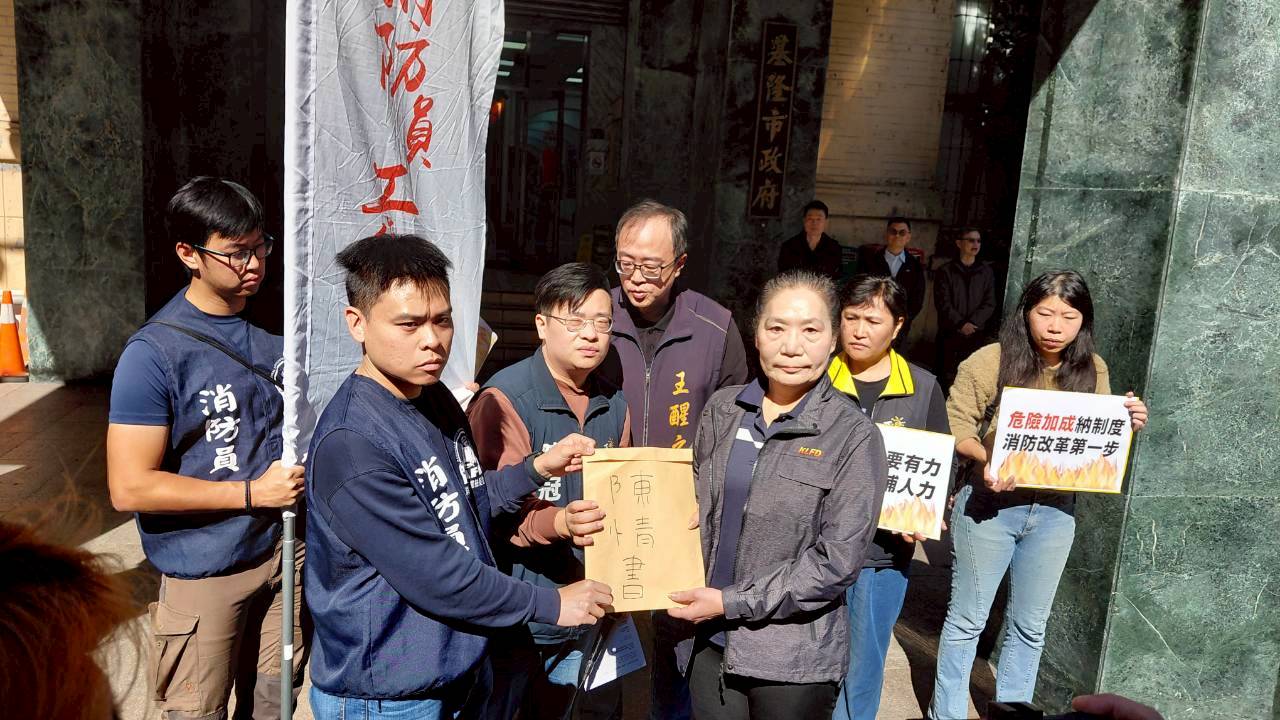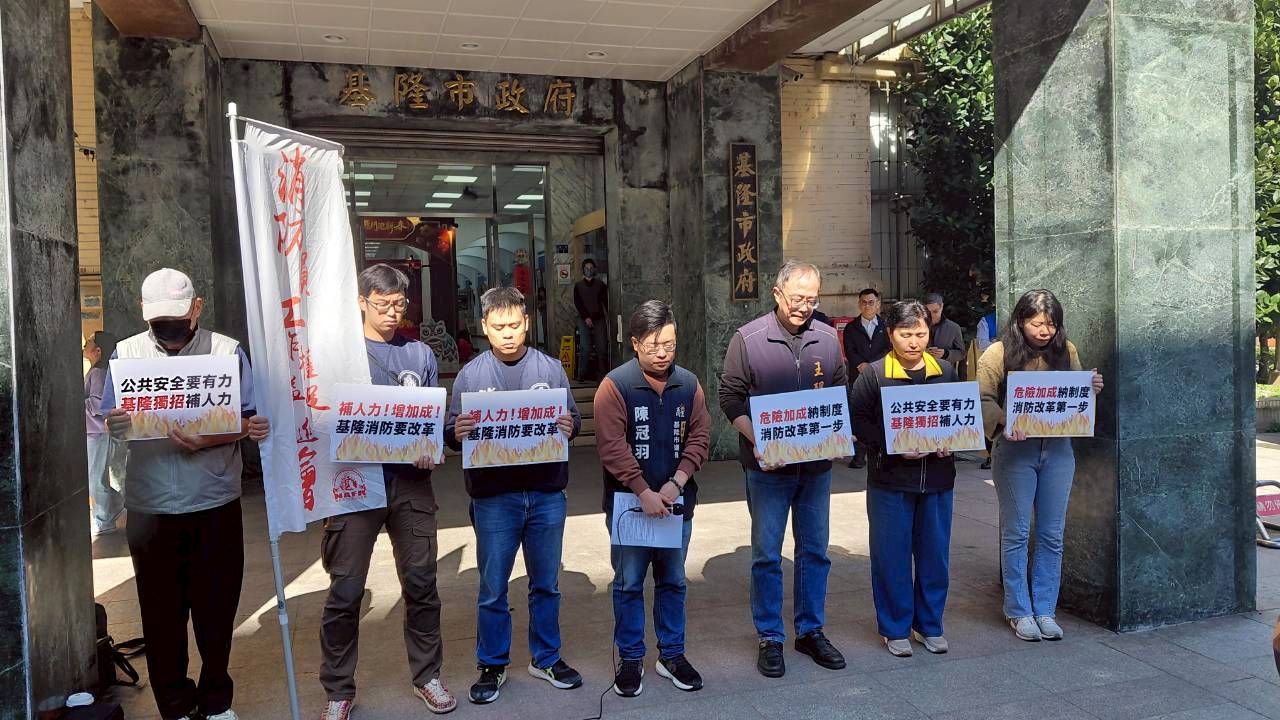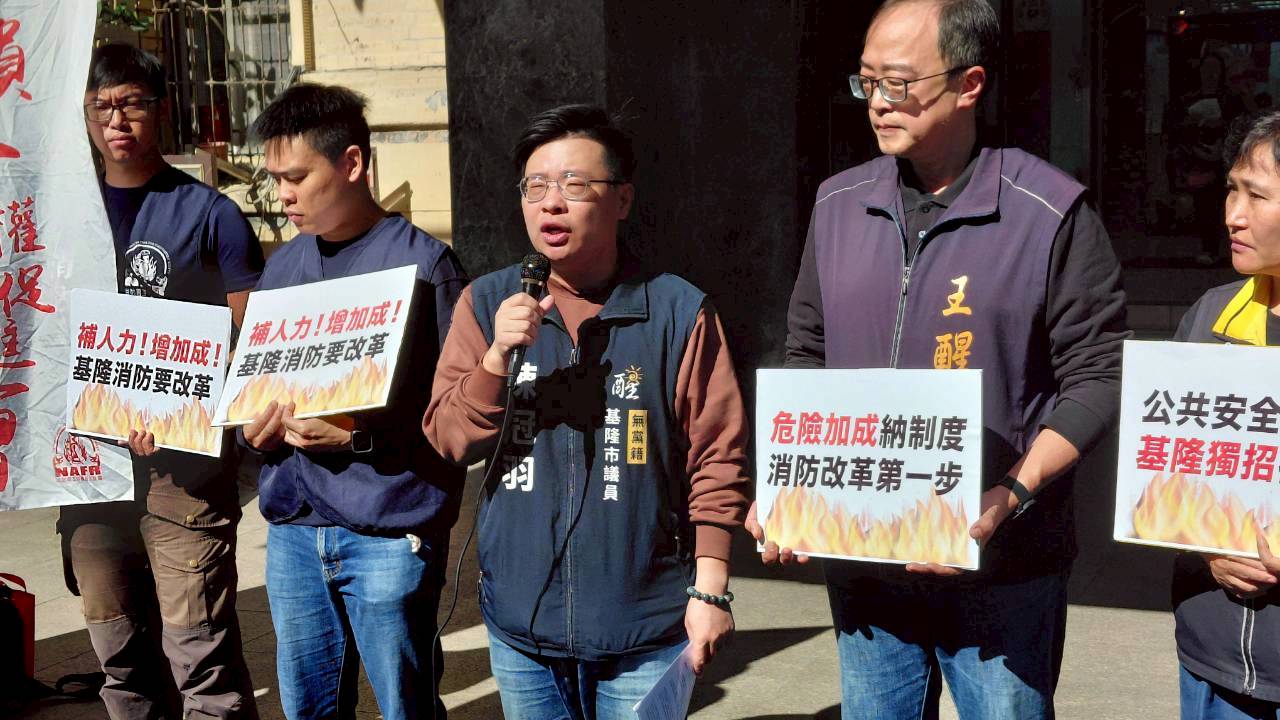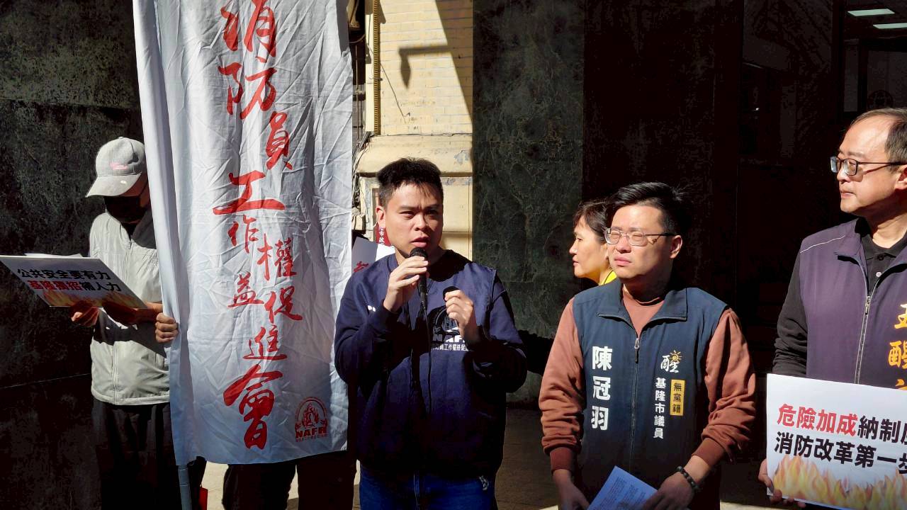 基隆市議員陳冠羽及消防員工作權益促進會今(13)於基隆市政府前召開記者會,呼籲基隆市政府應儘速補充消防人力並增加消防人員危險加給加成,提升消防人員待遇。